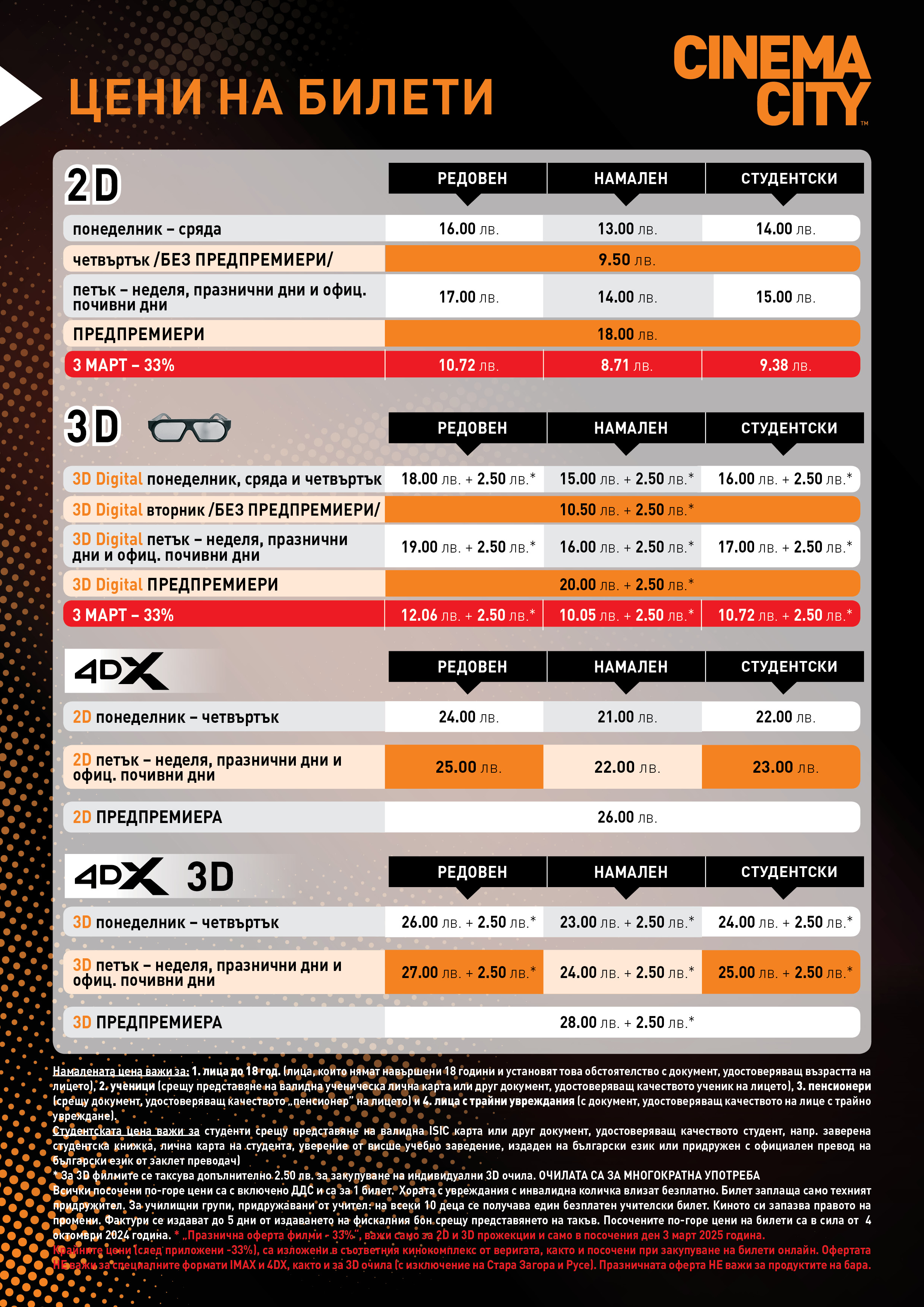 Ако искате да направите още по-голямо впечатление на вашите гости, препоръчваме нашата IMAX® зала (в София - Mall of Sofia) или 4DX® залите ни (в София - Парадайз Център, Пловдив и Варна).